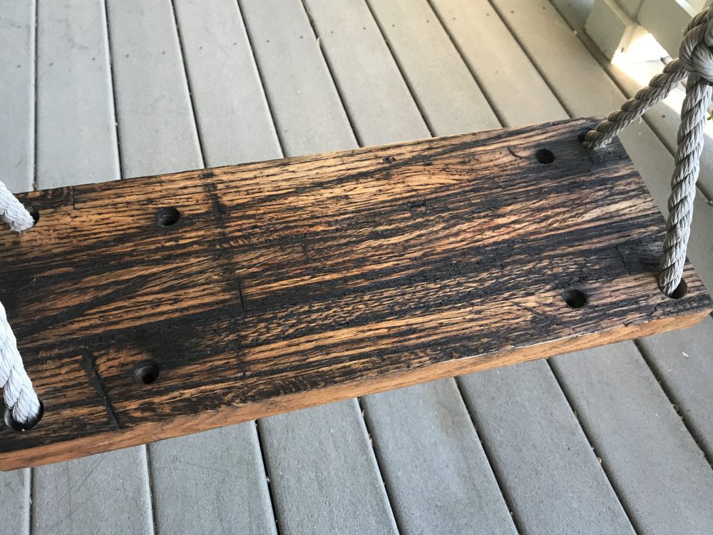 We started with a piece of hardwood. I had a piece of reclaimed white oak left over from another project, but any piece of solid wood that can withstand the elements will work. Drill two holes at each end of the piece large enough to pass some 1/2″ to 5/8″ rope through. We have been known to keep our swing up year -round so I used polypropylene rope. It stands up to weather really well. It also is unaffected by chemicals which is an advantage since I oil the wood a couple times a year.