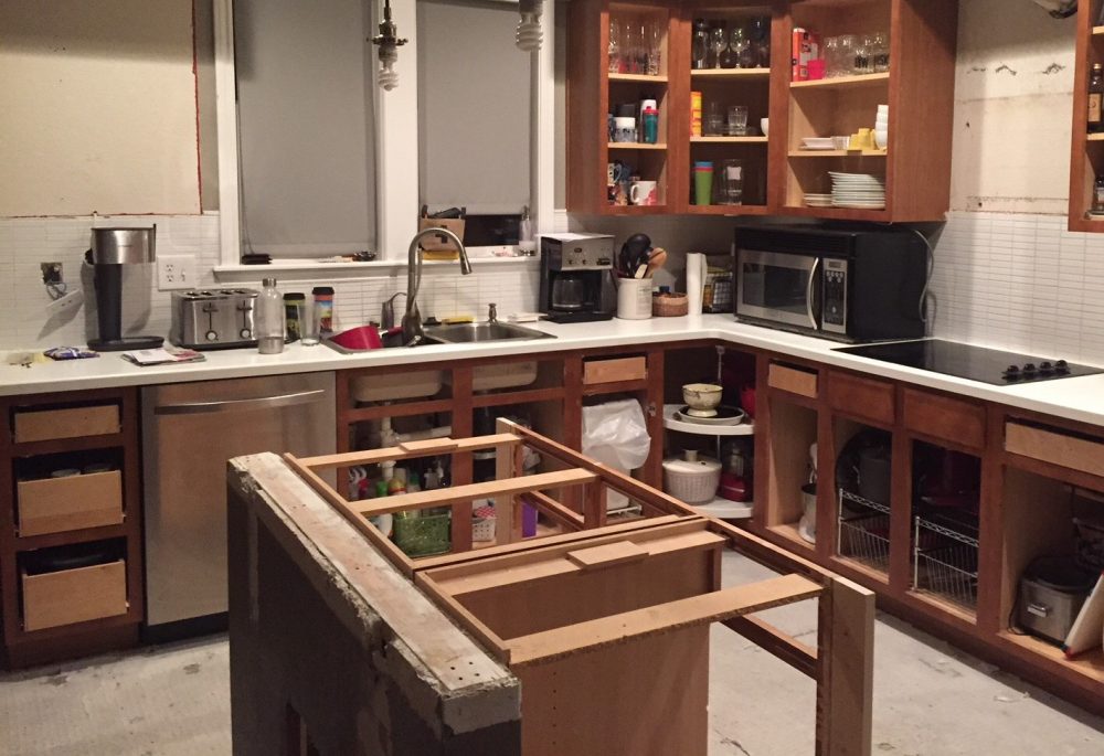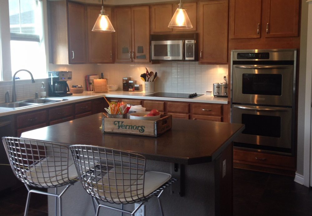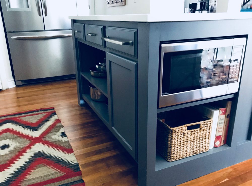 Last, but high on Kyn’s list was the island. Originally, it was three-floor cabinets set against a drywalled pony wall. We had panels and chunky corners built to replace the drywall. It makes it feel more like a piece of furniture. We removed the cabinet doors that faced the cooktop and reconfigured the area to accommodate open shelves for pots and pans. We then rebuilt one end of the island to house a microwave so the kids can utilize it. Our consumption of Annie’s White Cheddar Mac n’ Cheese bowls had increased considerably.