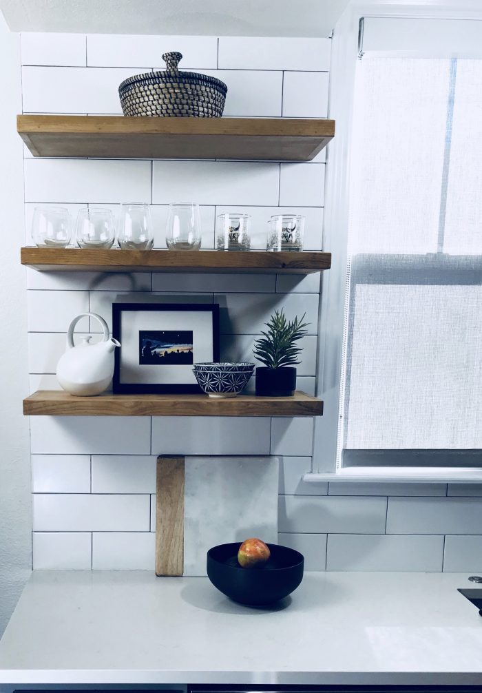 We removed one upper cabinet and replaced it with floating wood shelves. We did a DYI blog post about these shelves. It is a fairly simple project that gives the kitchen a great custom feel.
