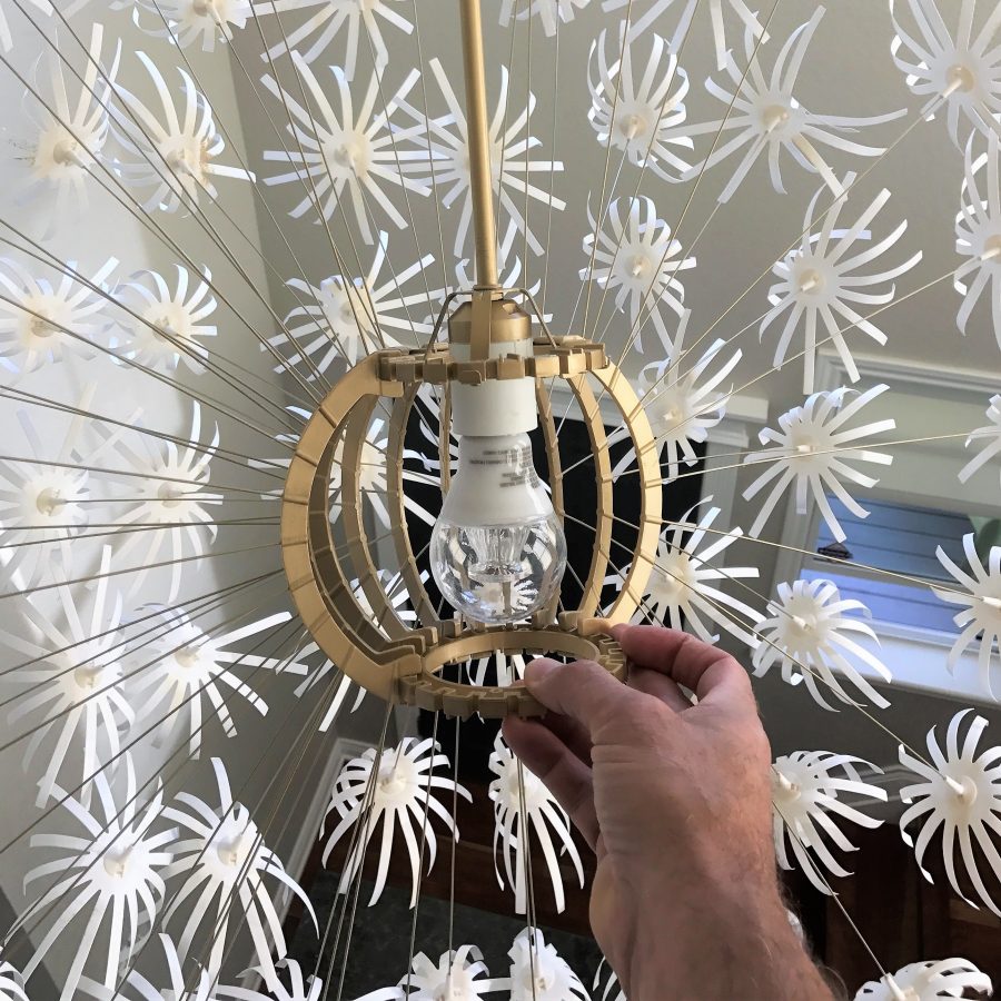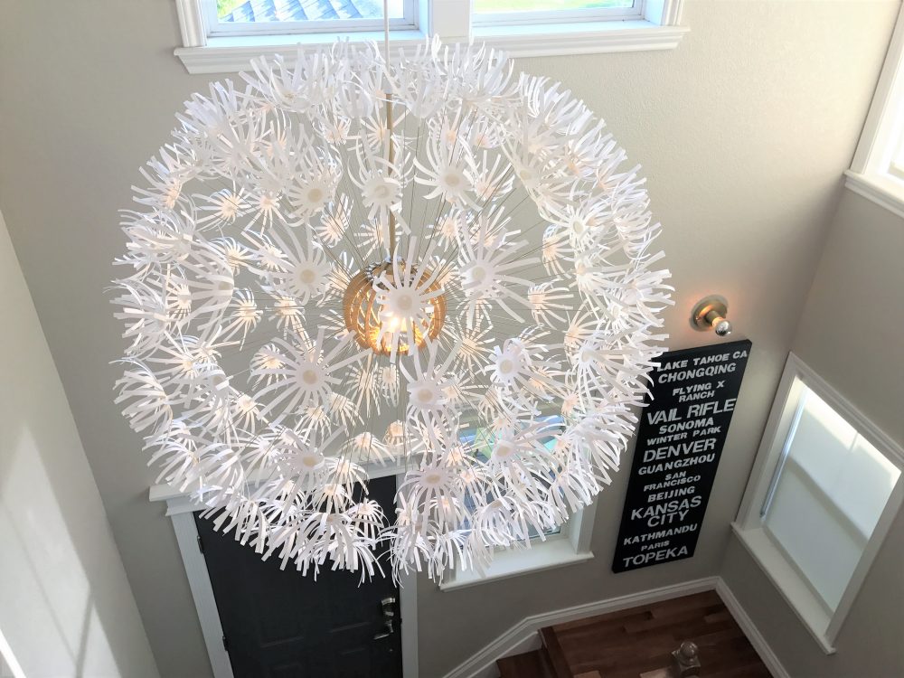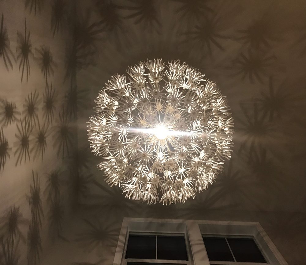A few months back, Kyn went on a girl’s weekend and the kids and I were left to fend for ourselves. This happens every once in a while and always seems to work out just fine. However, the law of averages states that if you flip a coin 3 times and it comes up heads, it’s most likely going to be tails on the fourth flip. Tails it is! Everything was great until the day she was coming home. I took the kids to school and came back home to clean up a bit for her arrival later in the afternoon.  I noticed that the chandelier in our entry was a bit dusty. It is an Ikea Maskros Pendant Lamp. I enjoy the “starbursty” shadows it throws on the ceiling and walls in our entryway.