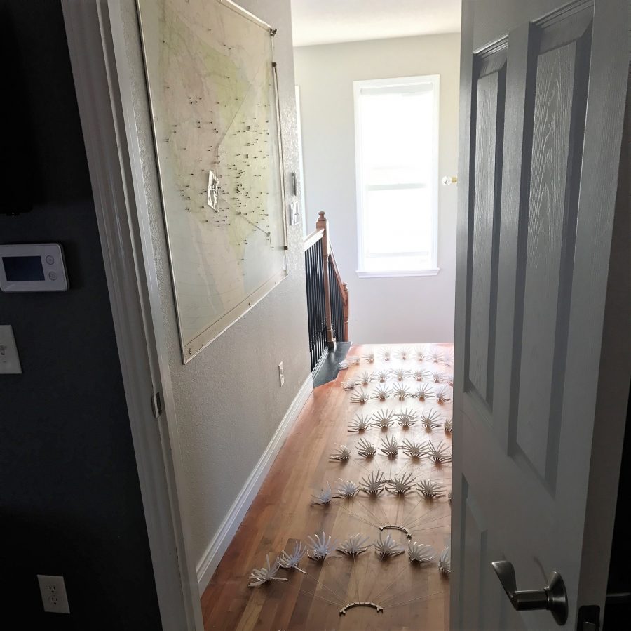 Plan C: What I had feared from the onset of this debacle had come to pass. There was nothing left to do but remove all the sections and paint them a color that would both cover the discoloration and be pleasing to the eye. I went with a bronzy-gold color. It was a risk, but if it didn’t look good I was going to have to pitch the thing and go buy a new one anyway. So, as Tim Gunn from Project Runway says, “make it work”! I disassembled the chandelier and masked off the parts I did not want to be gold; there could be no overspray! It seemed like there were 1000 sections, but I think there were around 40. They took a long time to prep, but after an hour or so I was ready to paint. I scattered all the sections out in the backyard and sprayed them one by one. After letting them dry, I removed all the masking tape and laid them out in the upstairs hallway. One by one, I ever so gently reassembled the pendant, finishing up with about 2 hours to spare. I decided to keep this whole sorted affair to myself and see how long it would take Kyn to notice, which I believe was all of  90 seconds. She also suspects it was an errant ball that originally broke the chandelier. To that I say “I was dusting the light… that’s my story and I’m sticking to it!”
