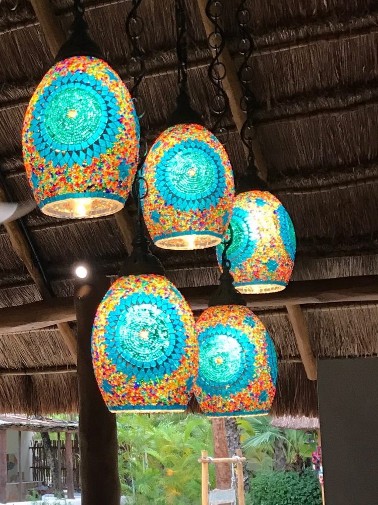 In the evenings, we walked up a tree-lined Av Andres Q Roo to the famous 5th Ave (Quinta Avenida) in old town Playa to eat, drink and walked through the shops. There is this great place called CARAVAN which has many unique and colorful glass chandeliers, as well as a great selection of textiles, pillows, wood and metal sculptures and print art. A fun place and they’ll ship stuff home for you!