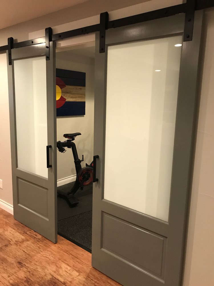 We designed the custom set of barn doors to close off the personal gym. We used milk glass to allow light to pass through while adding an element of privacy.