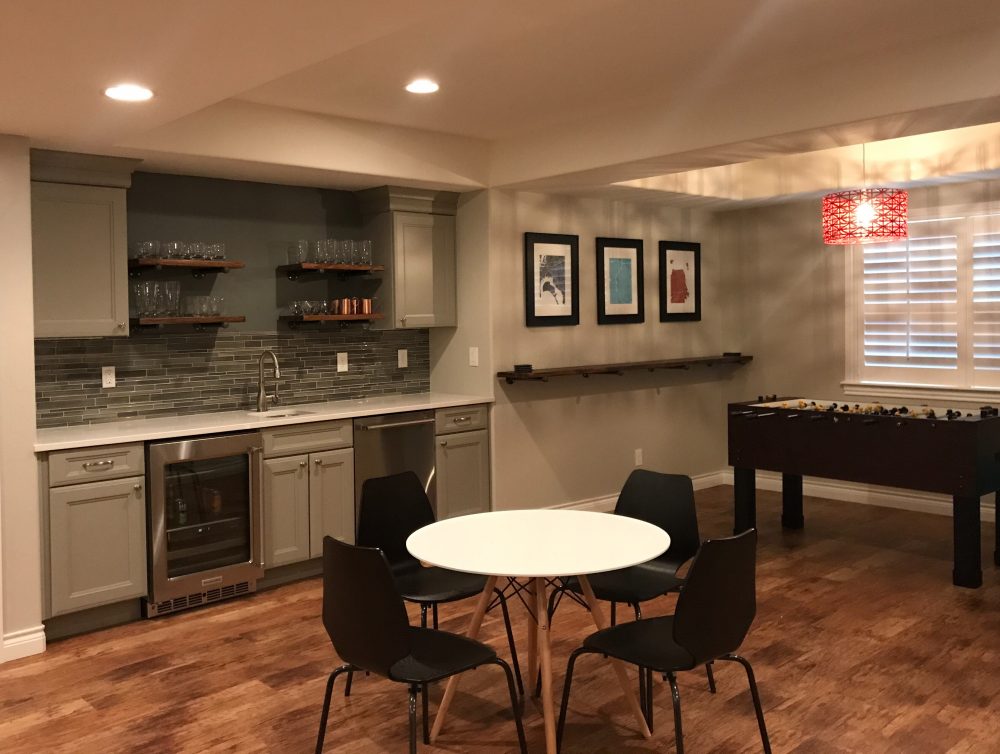 The bar area is fully functional with a KitchenAid dishwasher and bar fridge and reclaimed wood shelving for barware. Perfect for grabbing a cool drink during a hot game of foosball!