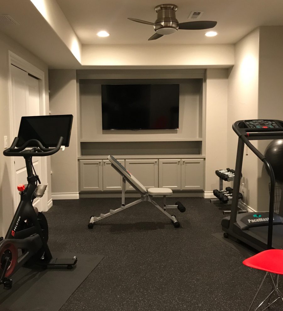 A well-designed workout space was important. Some of their requests were commercial grade gym flooring, closed cabinet storage for workout equipment, and an exhaust fan. They use this space every day!