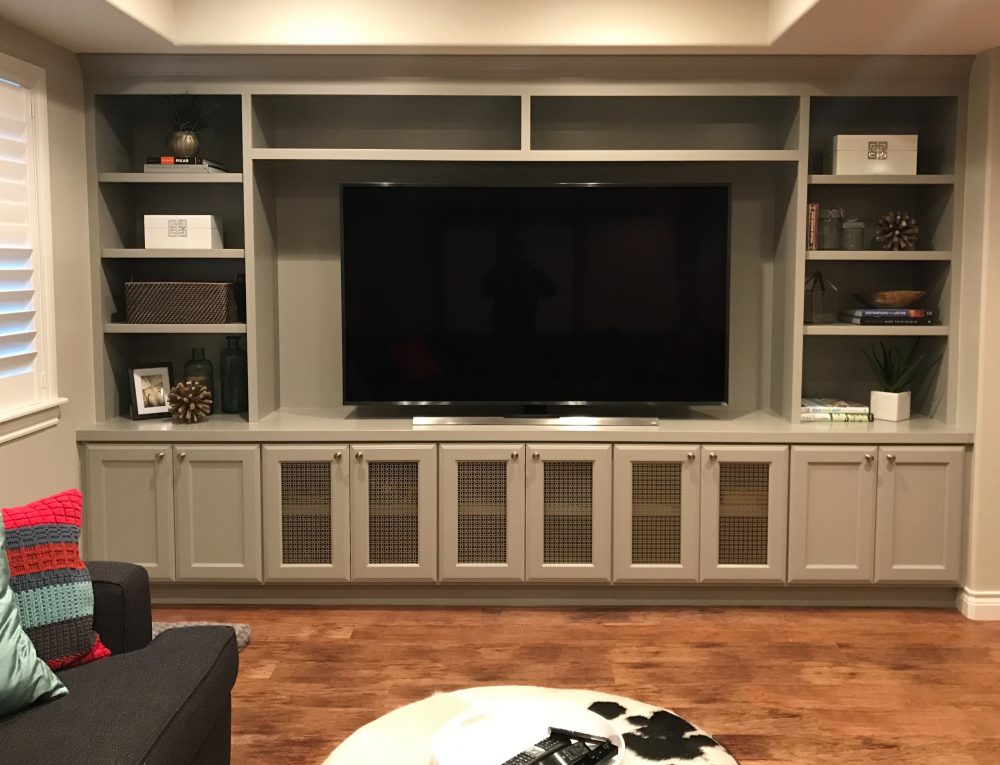 Kyndra designed the main builtin to be both pretty and functional. The stamped mesh panels look beautiful with the added function giving the A/V equipment adequate air flow and being kept out of sight.